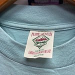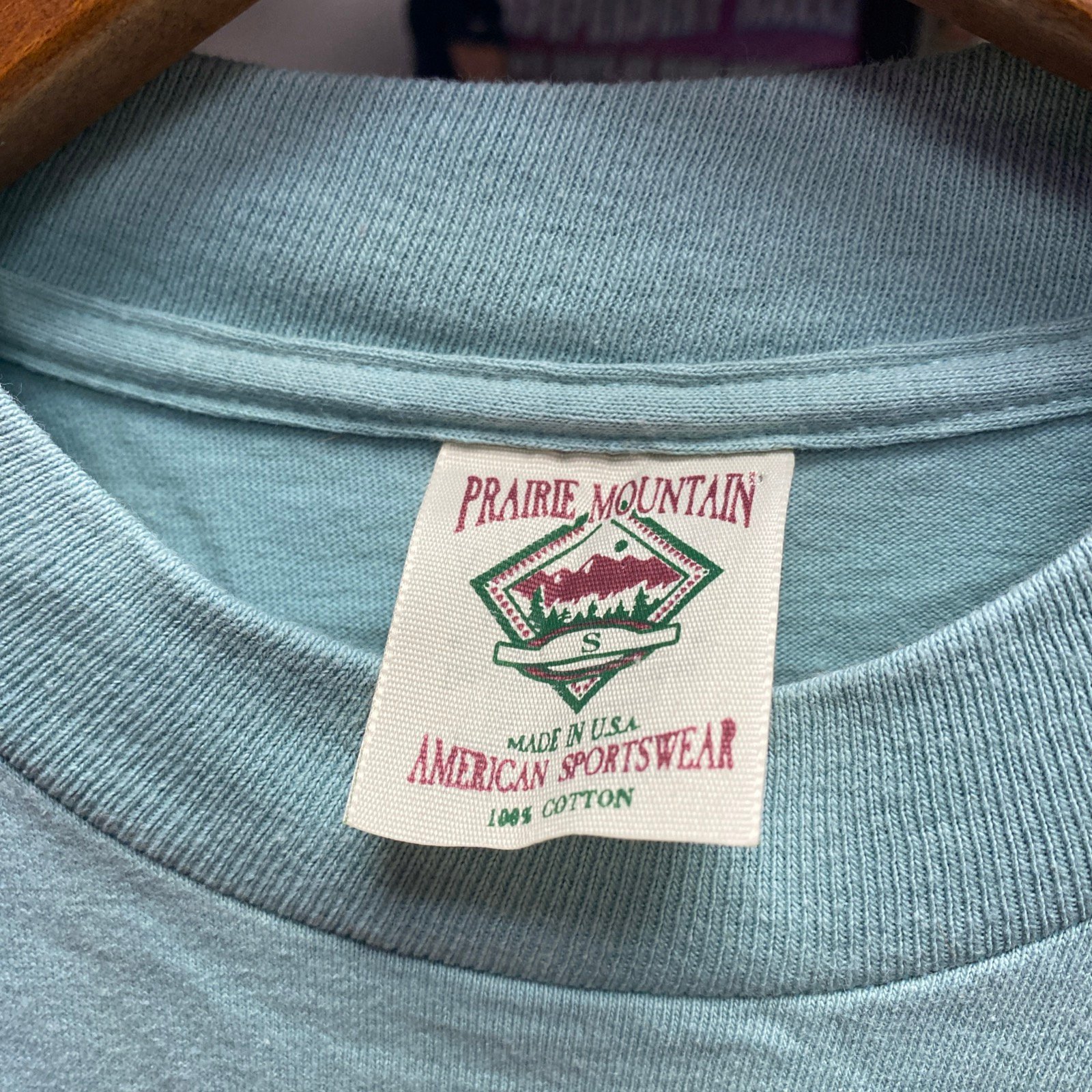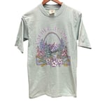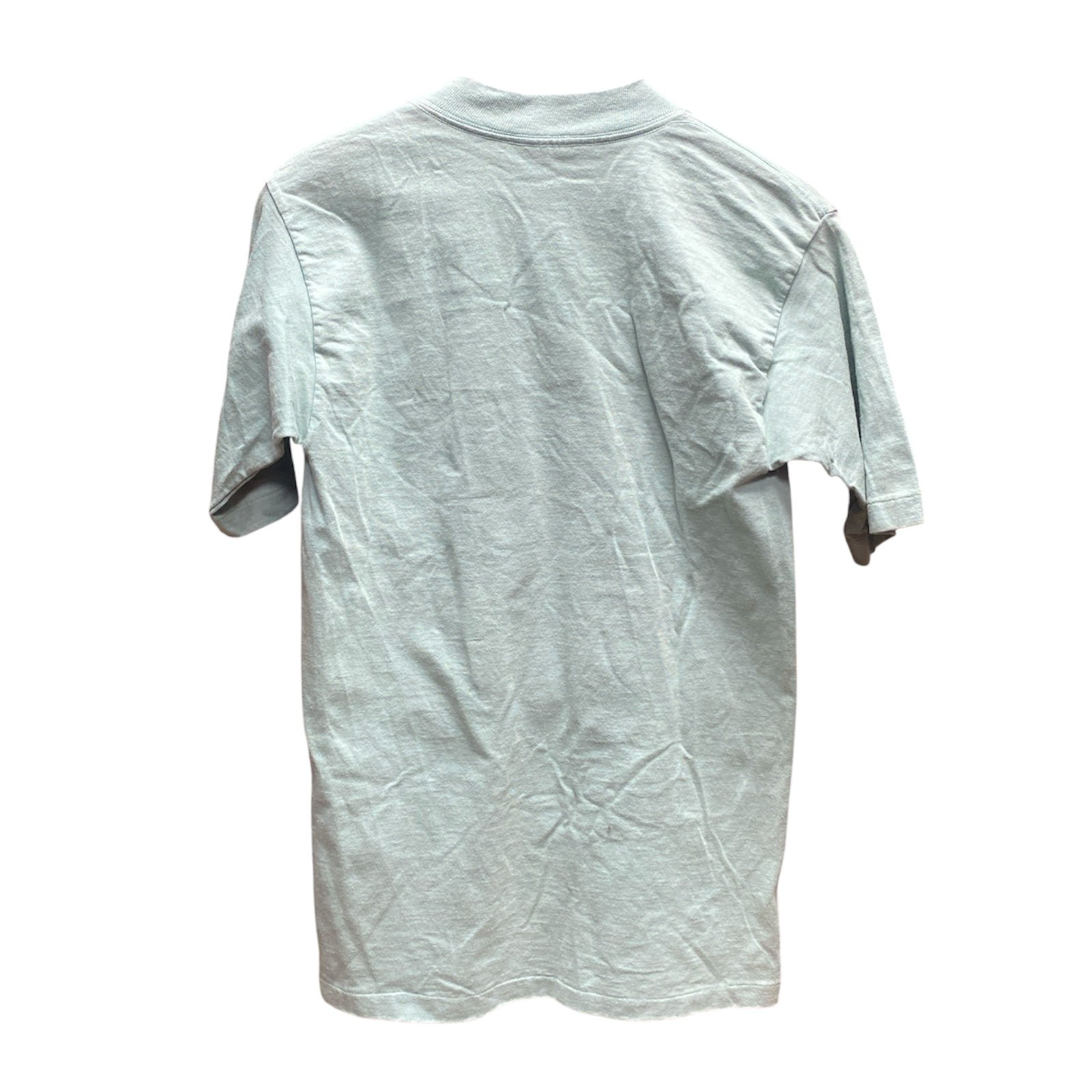 The product is a vintage single stitch small t-shirt made of cotton in turquoise color.