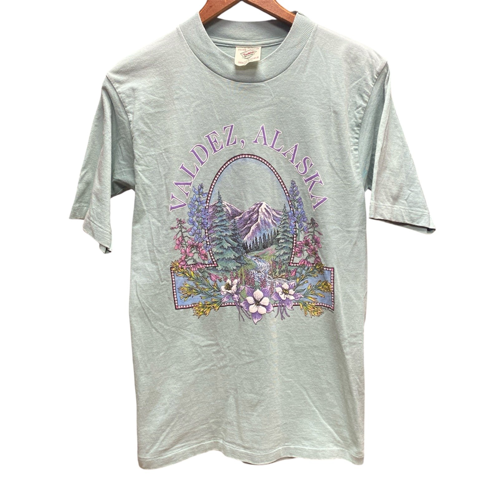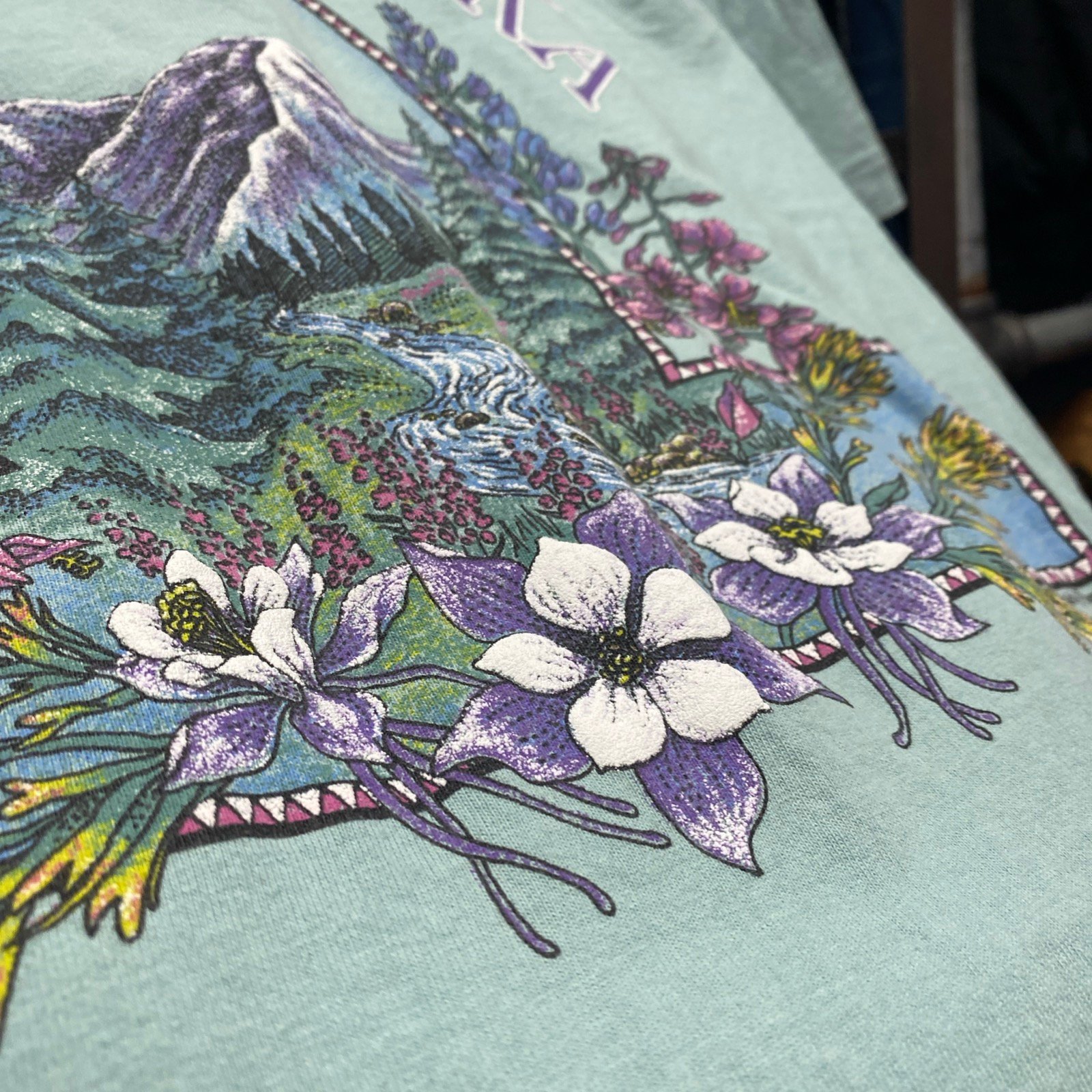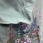 Approximately 16 inches pit to pit, and 26 inches top to bottom. This vintage screen printed Alaska souvenir t shirt has incredible detail all the way down to the puff print flowers. See photos for close details, ask any questions before purchase.